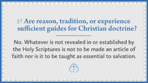 Are reason, tradition, or experience sufficient guides for Christian doctrine? | No. Whatever is not revealed in or established by the Holy Scriptures is not to be made an article of faith nor is it to be taught as essential to salvation.