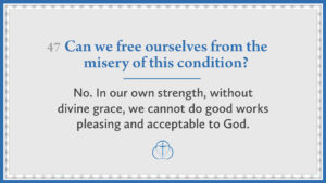 Can we free ourselves from the misery of this condition? | No. In our own strength, without divine grace, we cannot do good works pleasing and acceptable to God.